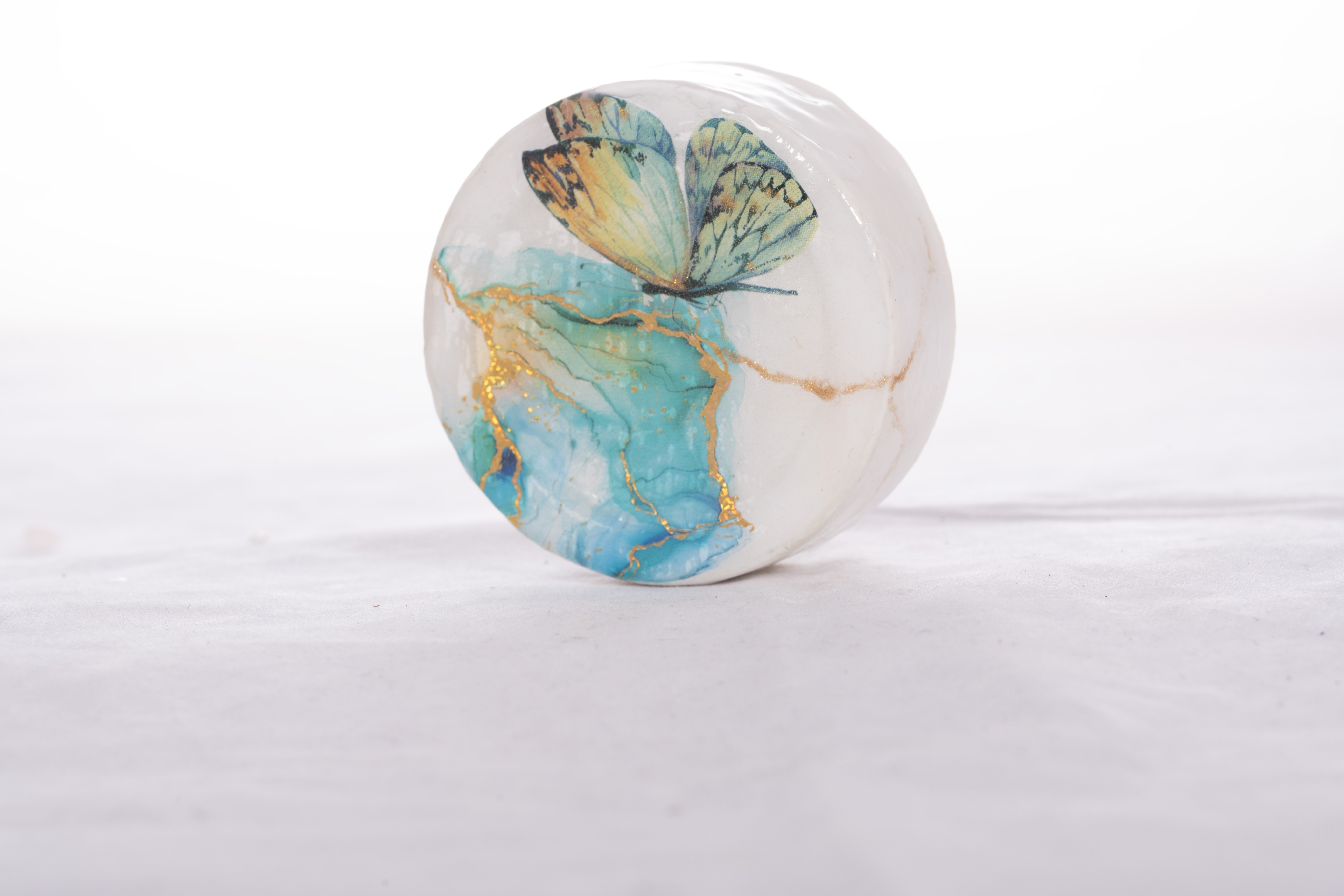 Deze prachtige vlinderdop is handbeschilderd door kunstenares Nicôle Coffe. De dop is afgewerkt met foodsafe resin.